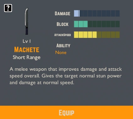 The Machete is a melee weapon, which can be unlocked by researching Machete Supply, which increase the quantity of the same weapon; of the Education Team department. The machete have a decent damage and stun, lesser than the Club but with higher attack speed. Its stats can be upgraded by researching Melee Weapon Upgrade. The initial quantity is 3, up to a maximum of 20.