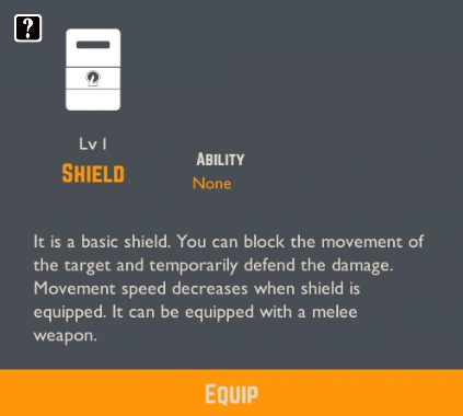The Shield is a protective equipment, which can be unlocked by researching Shield Upgrade, of the Safety Team department, for the first time. The Shield acts different than any other weapon: It can be equipped with a melee weapon, it increases the armor and stun power of the agent, and is able to block damage and movement of the target, but it also decreases the movement speed of the agent who is wielding it. These effects only are applied when is suppressing an Abnormality or hostile employee. The same research, Shield Upgrade, can increase the stats of this equipment and the research Shield Supply, of the same department, increases its quantity, which starts with 3 after being unlocked, up to a maximum of 20.