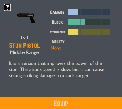 The Stun Pistol is a gun of strong stun, which can be unlocked by researching Stun Pistol Supply, which increase the quantity of the same weapon; of the Information Team department. The Stun Pistol's stats are similar to the Club, but with some increased attack speed and the agent can use it from a middle distance away of the target. Its stats can be upgraded by researching Pistol Upgrade. The initial quantity is 3, up to a maximum of 20. At the first level, the weapon has 6 bullets.