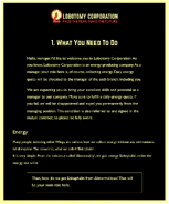 FACE THE FEAR, MAKE THE FUTURE 1.WHAT YOU NEED TO DO Hello manager I'd like to welcome you to Lobotomy Corporation. As you know, Lobotomy Corporation is an energy-producing company.As a manager your role here is, of course, collecting energy. Daily energy quota will be allocated to the manaer of the each branch, including you. We are expecting you to bring your excellent skills and potential as a manager to our company. Make sure to fulfill a daily energy quota. If you fail, we will be disappointed and expel you permanently from the managing position. This condition is also referred to and signed in the mutual contract, so please be fully aware. Energy Many people, including other Wings, are curious how we collect energy without any environmental disruption. The answer is, what we called ‘Enkephalin’. It is very simple. From the existence called ‘Abnormality’, we gain energy 'Enkephalin', refine the energy and sell it.