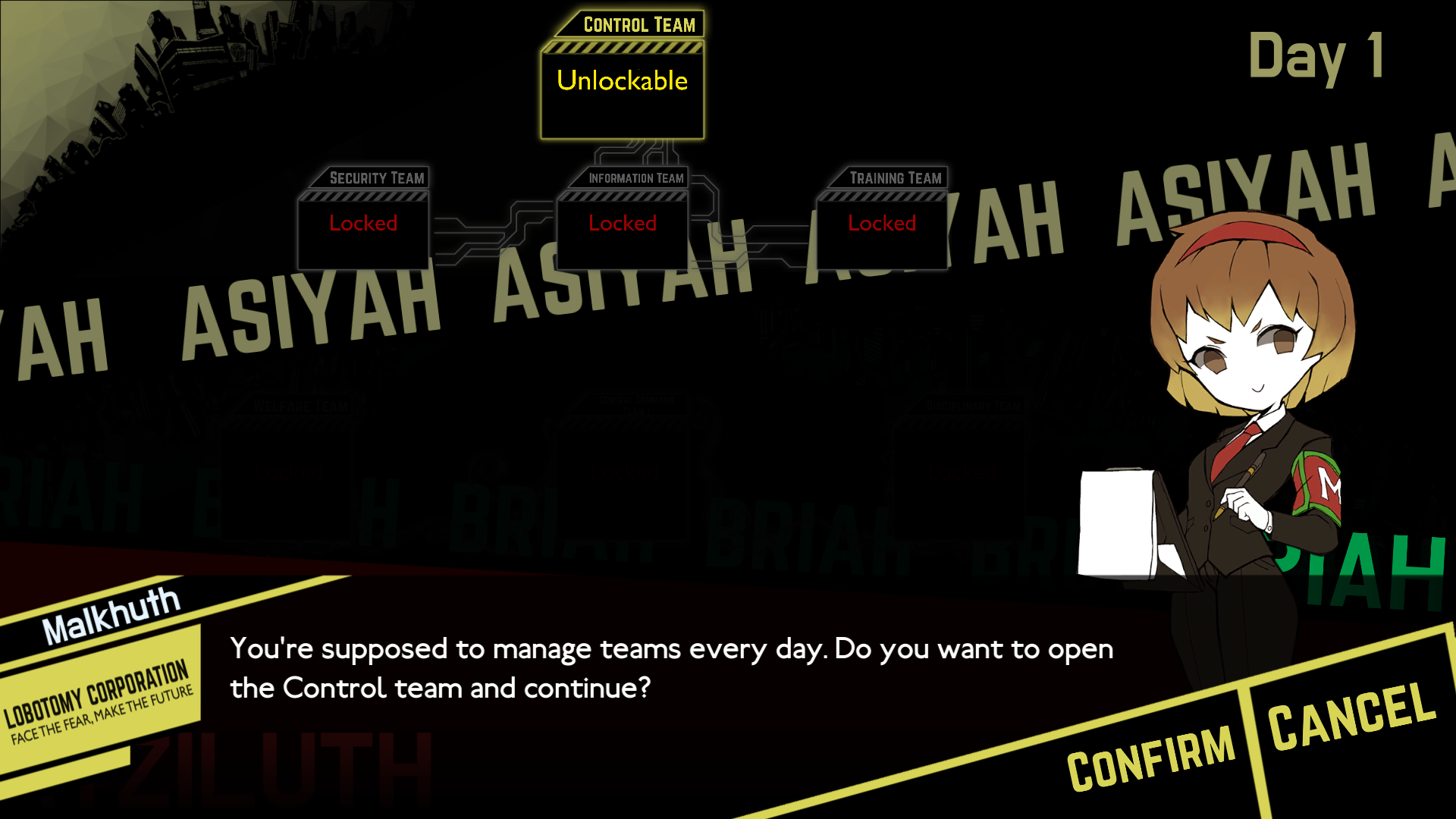 - "管理人!部門はいつでも開放して管理を開始できますよ!コントロールチームを開放して管理パートに行きますか?"