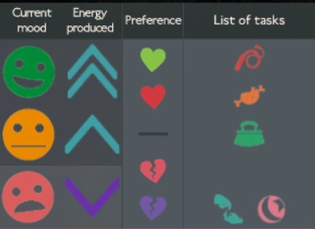 | 1 | +10% | -15% | 45% | 1 | 2 + アブノーマリティの名称 + 画像 + リスクレベル | 好き: 栄養 普通: 清潔 |