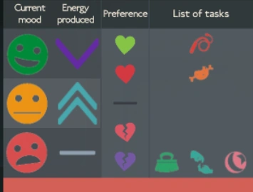 - エンサイクロペディアでは彼女は幸福時はエネルギーを消費すると書かれていますが、実際は生産します。おそらくバグである可能性が高いです。